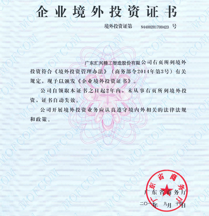 企業喜訊:熱烈慶賀匯興智造獲得企業境外投資證書