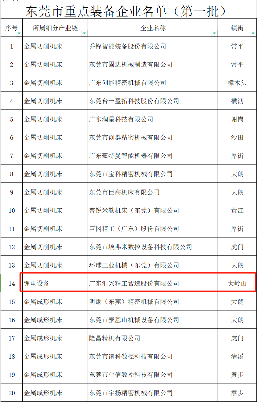 ▲ 廣東匯興精工智造股份有限公司非常榮幸進(jìn)入2024年首批“東莞市重點(diǎn)裝備企業(yè)”名單(是大嶺山鋰電設(shè)備唯一入選單位)。